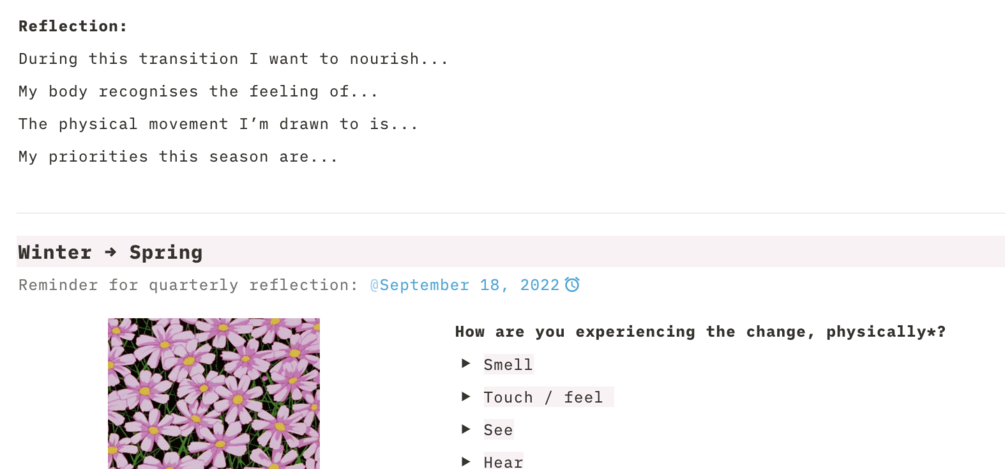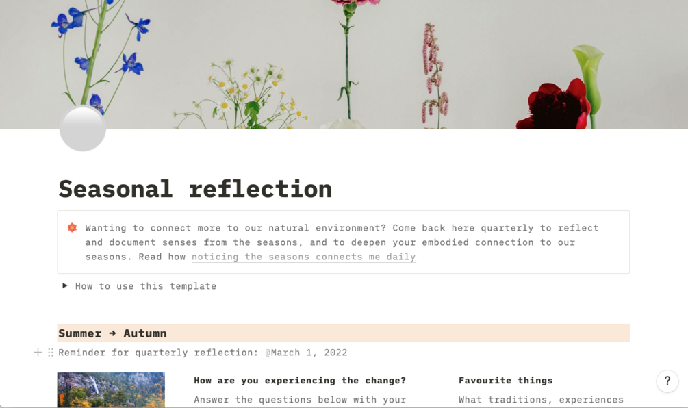 Wanting to connect more to our natural environment? Use this template to prompt reflections, and document senses from the seasons, to deepen your embodied connection to our seasons.